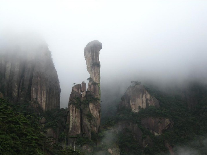 我们一路向上,三清山的景色也清晰起来。此时,已在半山腰了,远远望去,被人称做神女峰的山出现在了我们的视线中。最让我们难忘的还是女神峰了,一根巨石突兀青峰之中,宛若一个亭亭玉立、美丽动人的少女,虽然我未了解关于她的传说,但在我的印象里,她毫无疑问是神圣与端庄的。看起来,神女峰像是由两块石头组成的。一块是头,一块是身子。站在“神女峰”这块拍子边,向前看去,在两棵松树之间,刚好可看见神女峰。“神女”转过头,头发一直披到了肩上,身上披着大衣一直垂到脚底。此时此刻,美景美不胜收。